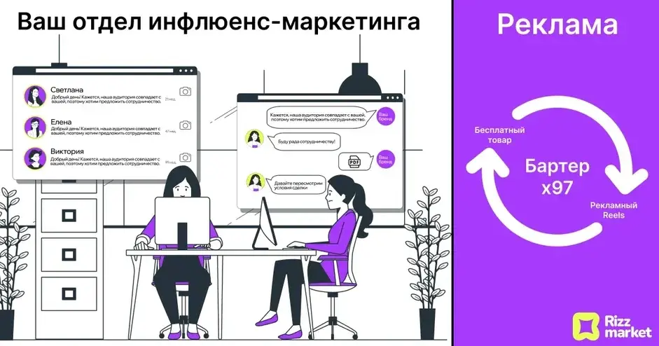 А еще наша команда из тех, кто болен делом. Вы уже знаете о пользе инфлюенс-маркетинга. А мы знаем, как сделать инфлюенс-маркетинг еще эффективнее и выгоднее. Свои методы и правила мы реализовали на платформе Rizz market. Так что…