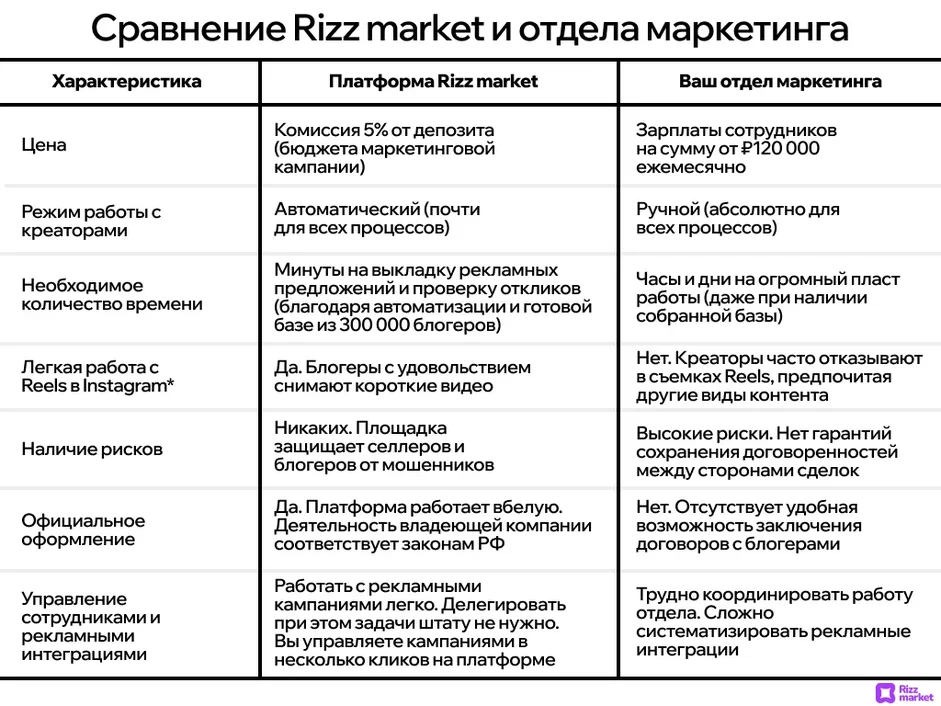 Таблица сравнения Rizz market и инфлюенс-маркетингового отдела