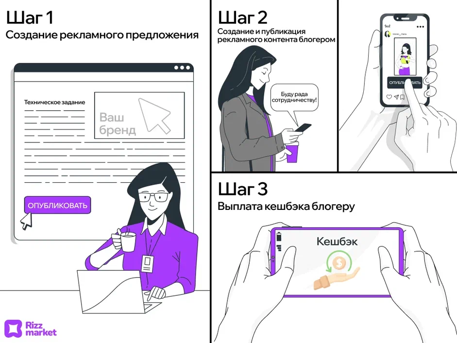 Сайт Rizz market — это платформа для массового сотрудничества с блогерами из социальных сетей. Здесь вы публикуете рекламные предложения, а креаторы сами ищут ваши офферы и оставляют отклики. Затем вы выбираете подходящих кандидатов и работаете с ними по бартеру:
